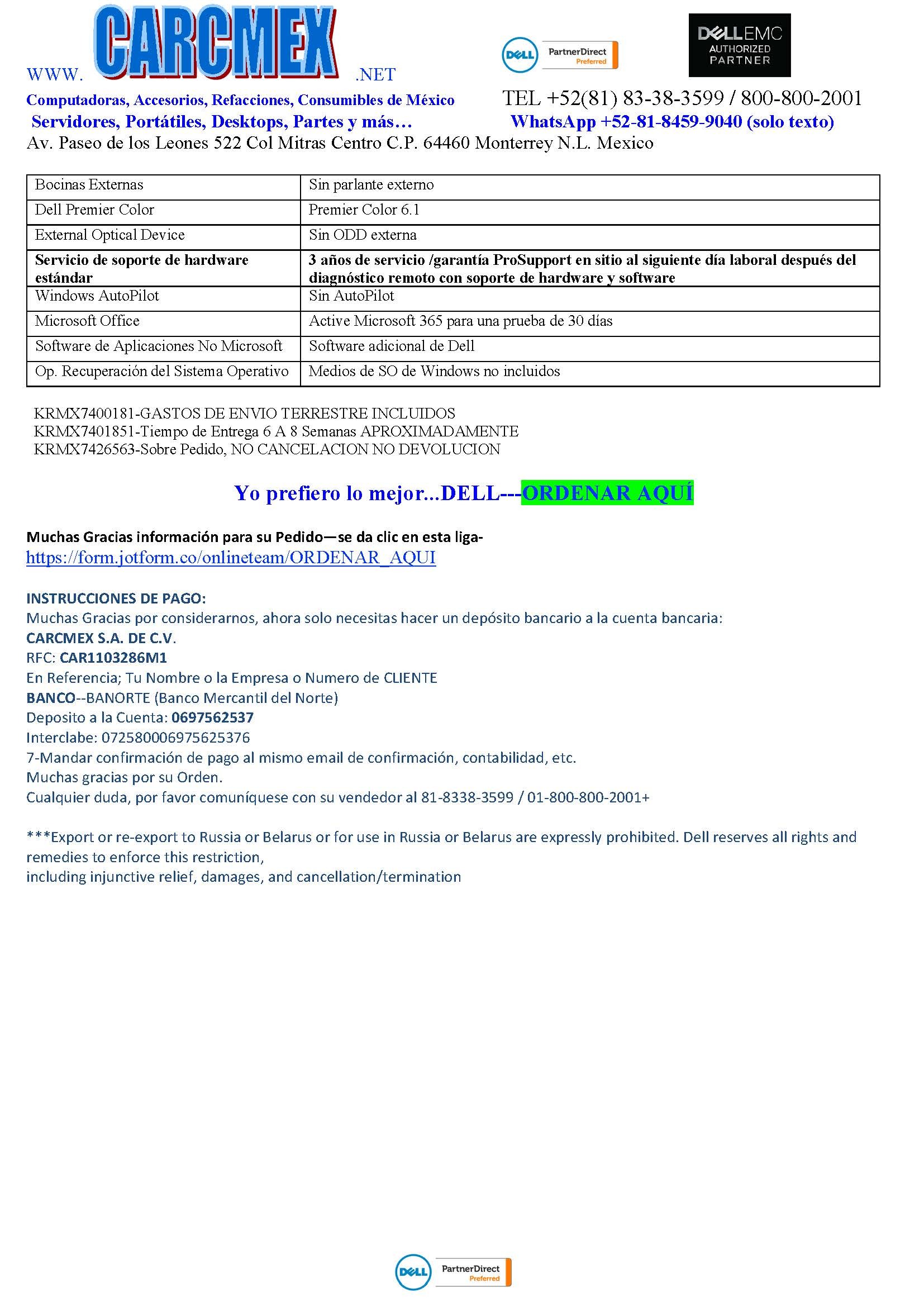 NO Aceptamos pedidos por vía telefónica. Comuníquese con su representante antes de enviar su orden de compra.